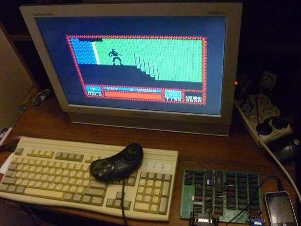 Изображение правда немного двоит. Проверил на LCD телевизоре, двоения не видно. Картинка отличная. Супер! Но на моей плате еще есть свободное место и глупо было бы его не использовать. Сделать расширение памяти до 128к и поиграть в кастлванию 2015 года было бы здорово. Для этого поменяем наши К565РУ5 на К565РУ7 или аналог MN41256-08, который без проблем можно купить на алиэкспресс. Добавив еще 7 микросхем, включая звуковой чип YM2149F плату заполнил полностью. Проблем никаких с апгрейдом памяти не возникло. Расширял память до 256к по этой схеме, но все же использую ее в режиме 128к.