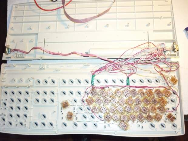 Но ведь для спектрума нужна еще и клавиатура. Тут я выкрутился довольно оригинально, взял старую клавиатуру, вытащил из нее пленку с контактами, порезал гетинакс на кусочки, напаял на него контакты, обработал их напильником и приклеил термоклеем к клаве, ну и спаял их по схеме. Получилась довольно громоздкая внешняя клава. Ну и порты для синклер джойстиков прямо в клавиатуру встроил. Подходят джойстики от сега мастер систем или атари, ну или как в моем случае перепаяный внутри сеговский джойстик, для которого я вывел клавишу пробел(а именно она почти всегда используется как дополнительная ) на кнопку А, ну и при нажатии кнопки С дублируется нажатие вверх, что удобно в платформерах.