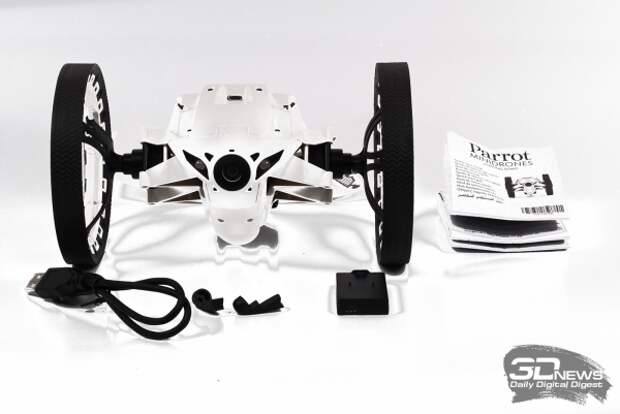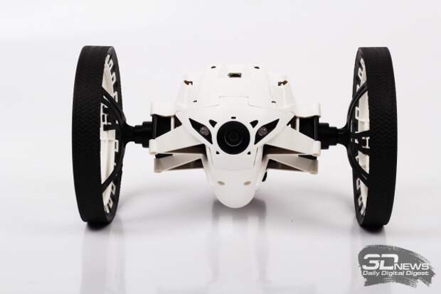 Sumo Jumper внешне похож на глазное яблоко на колесах. Центром всей конструкции является фронтальная VGA-камера, которая немного утоплена в корпус, что защищает ее от повреждений при столкновении с препятствиями. Корпус этого дрона тоже сделан из пластмассы, но по ощущениям не кажется таким же безупречно прочным, как у Rolling Spider. В Интернете достаточно отзывов о том, что слабым местом в конструкции является механизм для прыжков, расположенный сзади (дрон опирается на него, когда стоит) и основанный на двух пружинах. В отзывах сообщается, что надолго его не хватает, иногда он ломается буквально раз в неделю. Детально рассмотрев конструкцию, можно прийти к выводу, что, скорее всего, это связано с слишком экстремальным использованием функции прыжков или с неудачными приземлениями. Единственным слабым местом этого механизма являются сами пружины (которые теоретически можно заменить самостоятельно), а все детали выполнены из железа. После испытаний самым слабым местом дрона оказались каучуковые колеса, которые местами изрядно помялись от неудачных прыжков и приземлений с высоты в полметра. Но колеса легко заменить, и они тоже продаются отдельно.